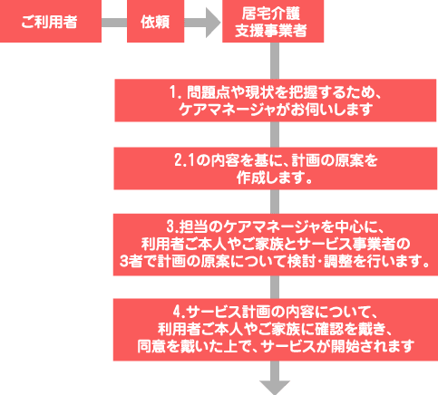 ※サービスの提供が開始された後でも、必要に応じてサービス計画の見直しを致しますので、お気軽にご相談下さい。